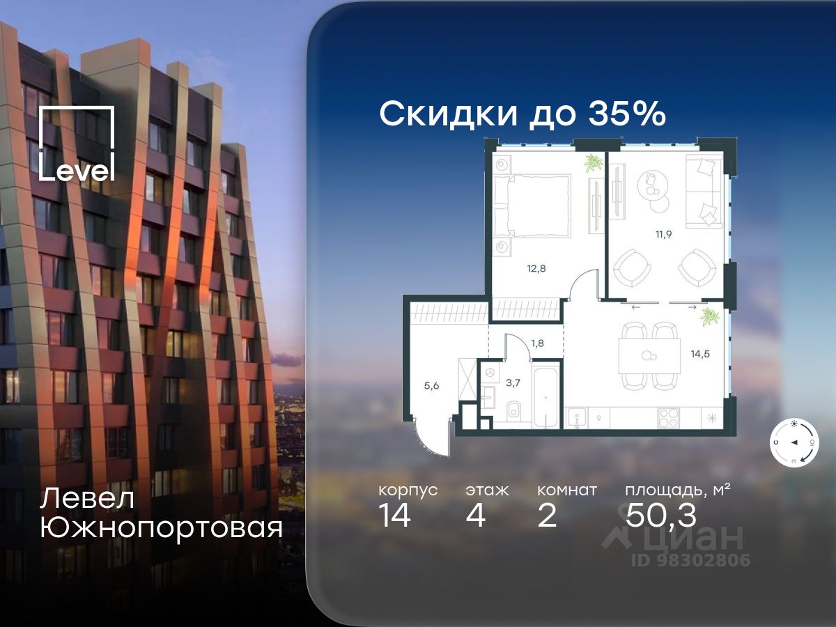 В северной части района Печатники продается 2-комнатный апартамент площадью 50.30 кв.м без отделки. Апартаменты расположены на 4 этаже 13-этажного корпуса 14 в жилом комплексе комфорт-класса Левел Южнопортовая (компания Level Group/Левел групп).
