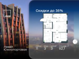 В северной части района Печатники продается 3-комнатная квартира площадью 62.10 кв.м без отделки. Квартира расположена на 3 этаже 16-этажного корпуса 11 в жилом комплексе комфорт-класса Левел Южнопортовая (компания Level Group/Левел групп).