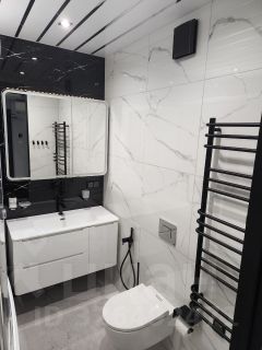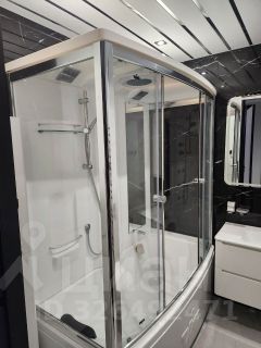 Ванная комната: Просторная душевая кабина с функцией паровой бани, стильная навесная мебель, полотенцесушитель и резервный водонагреватель.