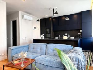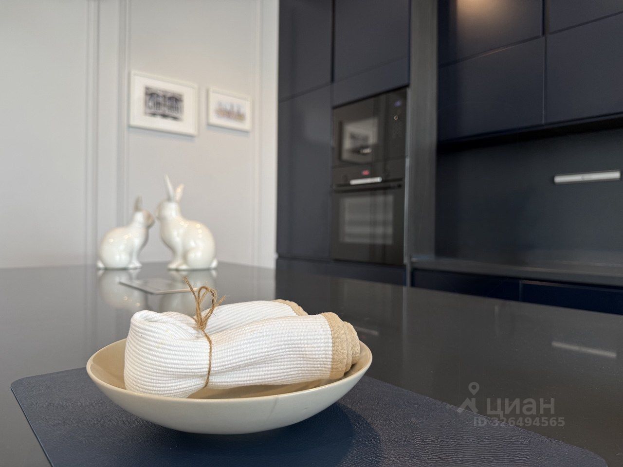 Кухня укомплектована премиальной техникой Bosch (холодильник, индукция, духовой шкаф, СВЧ, ПММ). В зоне отдыха — большой диван и ТВ-зона.