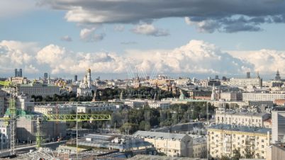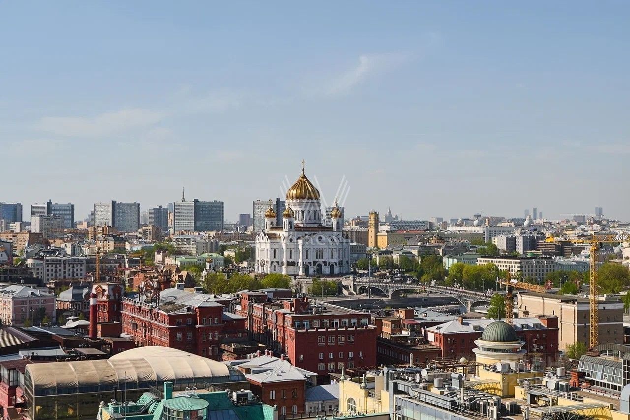 В квартире спланировано широкое арочное окно, открываются живописные виды на город, Храм Христа Спасителя, памятник Петру I и Москву-реку.