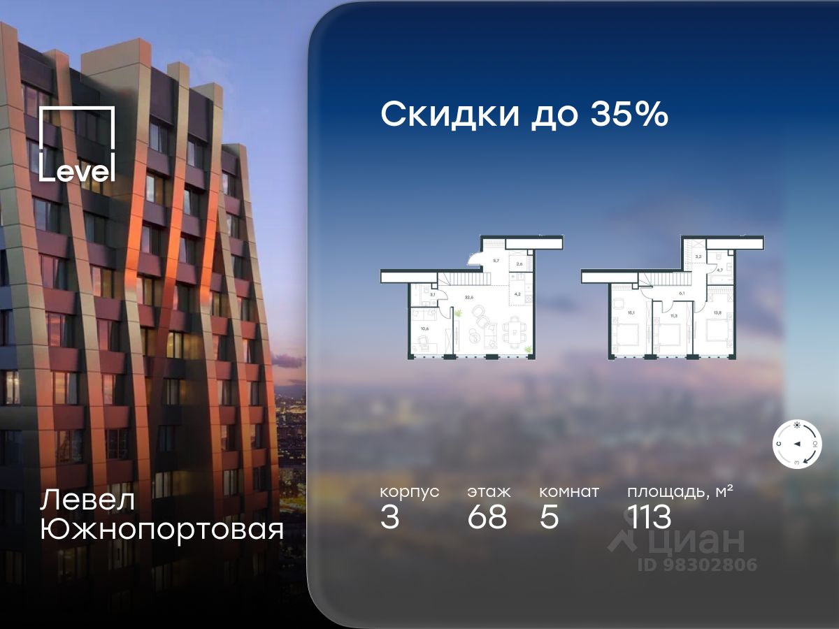 В северной части района Печатники продается многокомнатная квартира площадью 113.00 кв.м без отделки. Квартира расположена на 68 этаже 68-этажного корпуса 3 в жилом комплексе комфорт-класса Левел Южнопортовая (компания Level Group/Левел групп).