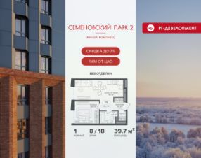 Продается 1-к квартира 39,7 кв.м. в ЖК "Семеновский парк 2" на 8-м этаже 18 этажного дома.