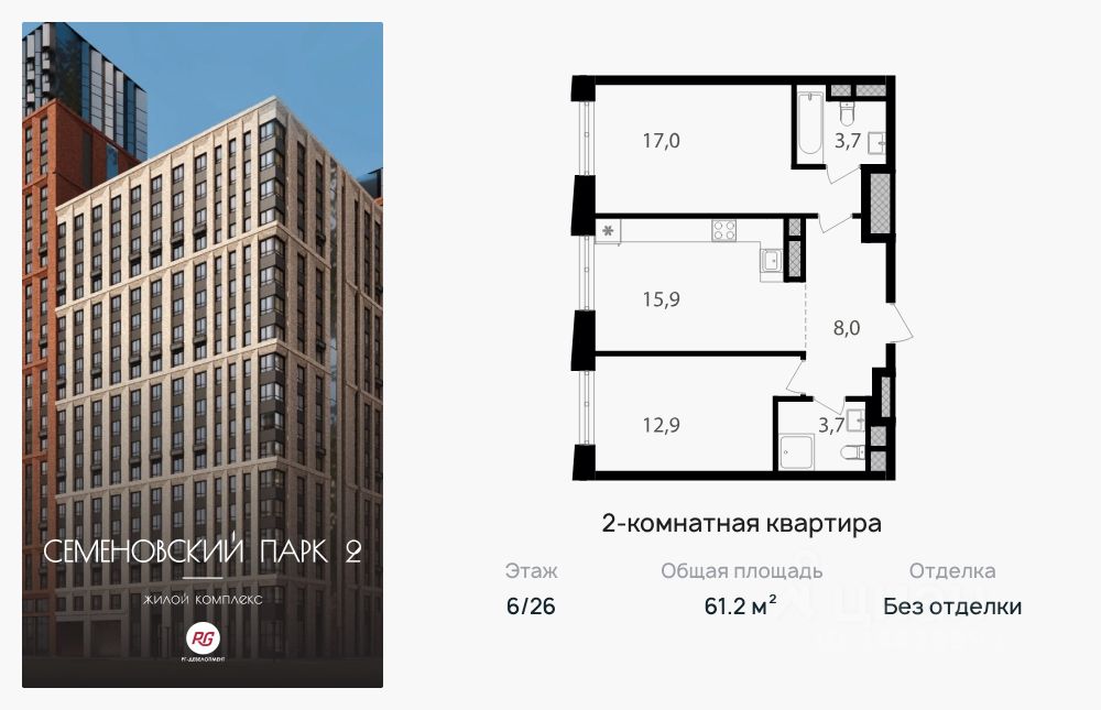 Продается 2-к квартира 61,2 кв.м. в ЖК "Семеновский парк 2" на 6-м этаже 26 этажного дома.