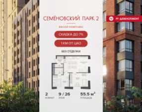 Продается 2-к квартира 55,5 кв.м. в ЖК "Семеновский парк 2" на 9-м этаже 26 этажного дома.