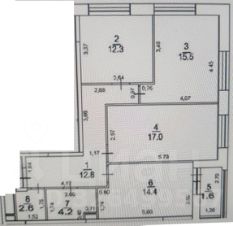 Квартира с ремонтом общей площадью 80 кв.м. (78,8 кв.м. площадь без учёта лоджии), три изолированные комнаты площадью 17; 15,5 и 12,3 кв.м.,просторная кухня площадью 14,4 кв.м. с выходом на лоджию, 2 санузла площадью 4,2 и 2,6 кв.м. Высота потолка 3м.