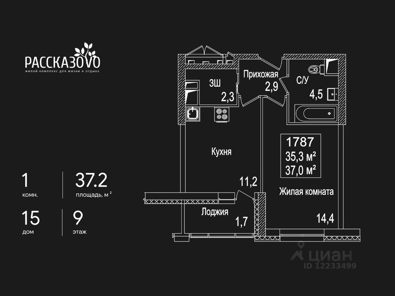 Продается 1-комнатная квартира в ЖК Рассказово на 9 этаже. Общая площадь квартиры составляет 37,2 кв.м. Квартира без отделки.