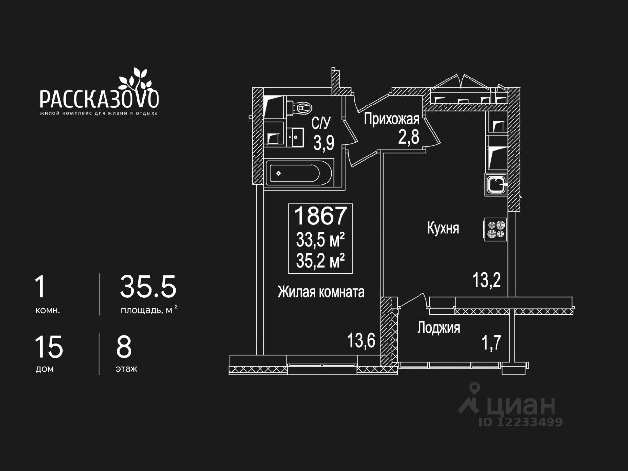 Продается 1-комнатная квартира в ЖК Рассказово на 8 этаже. Общая площадь квартиры составляет 35,5 кв.м. Квартира без отделки.