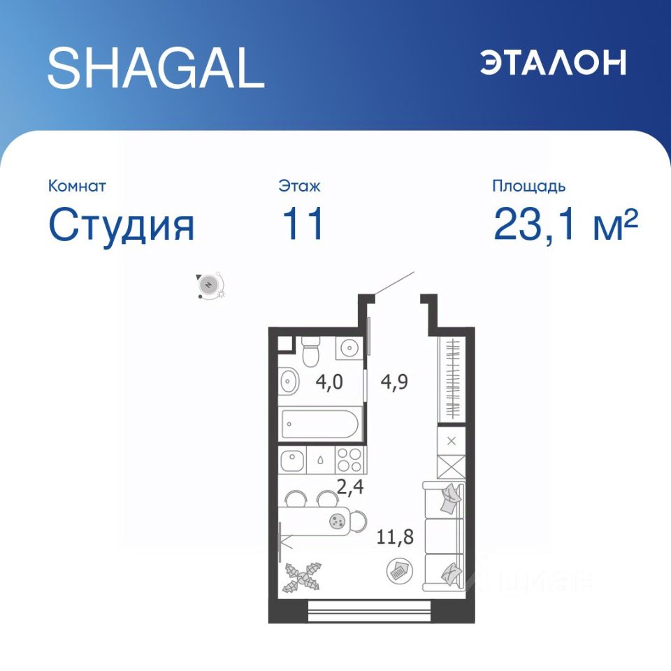 Общая площадь квартиры — 23.1 кв. м, этаж 11 из 18.