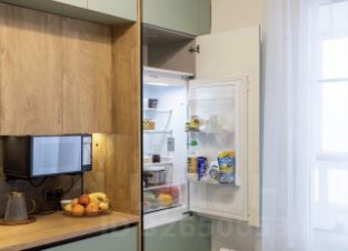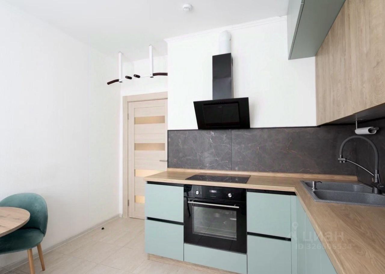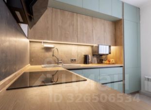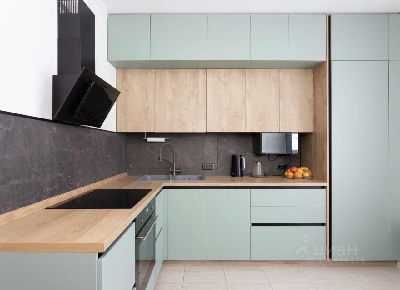 Квартира оформлена в актуальной спокойной цветовой гамме: натуральное дерево, матовые фасады, лаконичный минимализм.