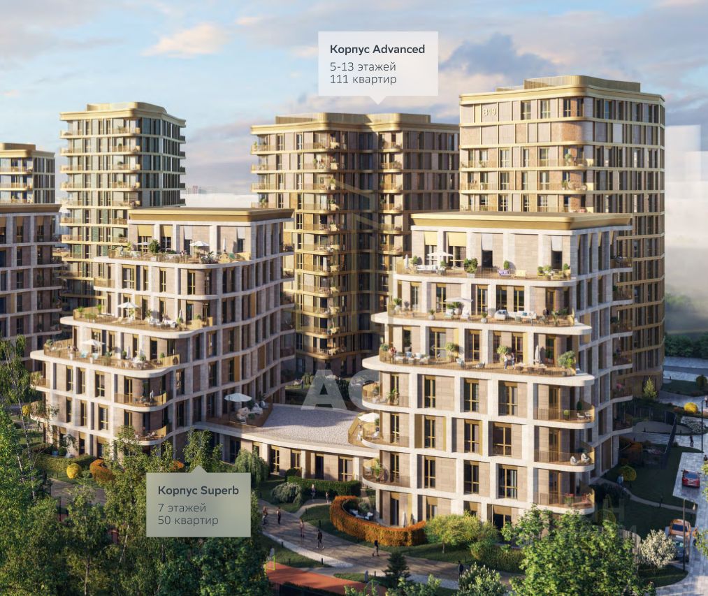 Отделка фасадов корпуса класса Адвансд выполнена из природного камня, глазурованной плитки и алюминия. Дом возводится по технологии монолитного строительства. В квартире проведены работы по улучшению шумоизоляции, установлены двухкамерные стеклопакеты с низкоэмиссионными стёклами, минимизирующими теплопотери. Высота окон — от 3 до 3,25 м. В доме расположены: