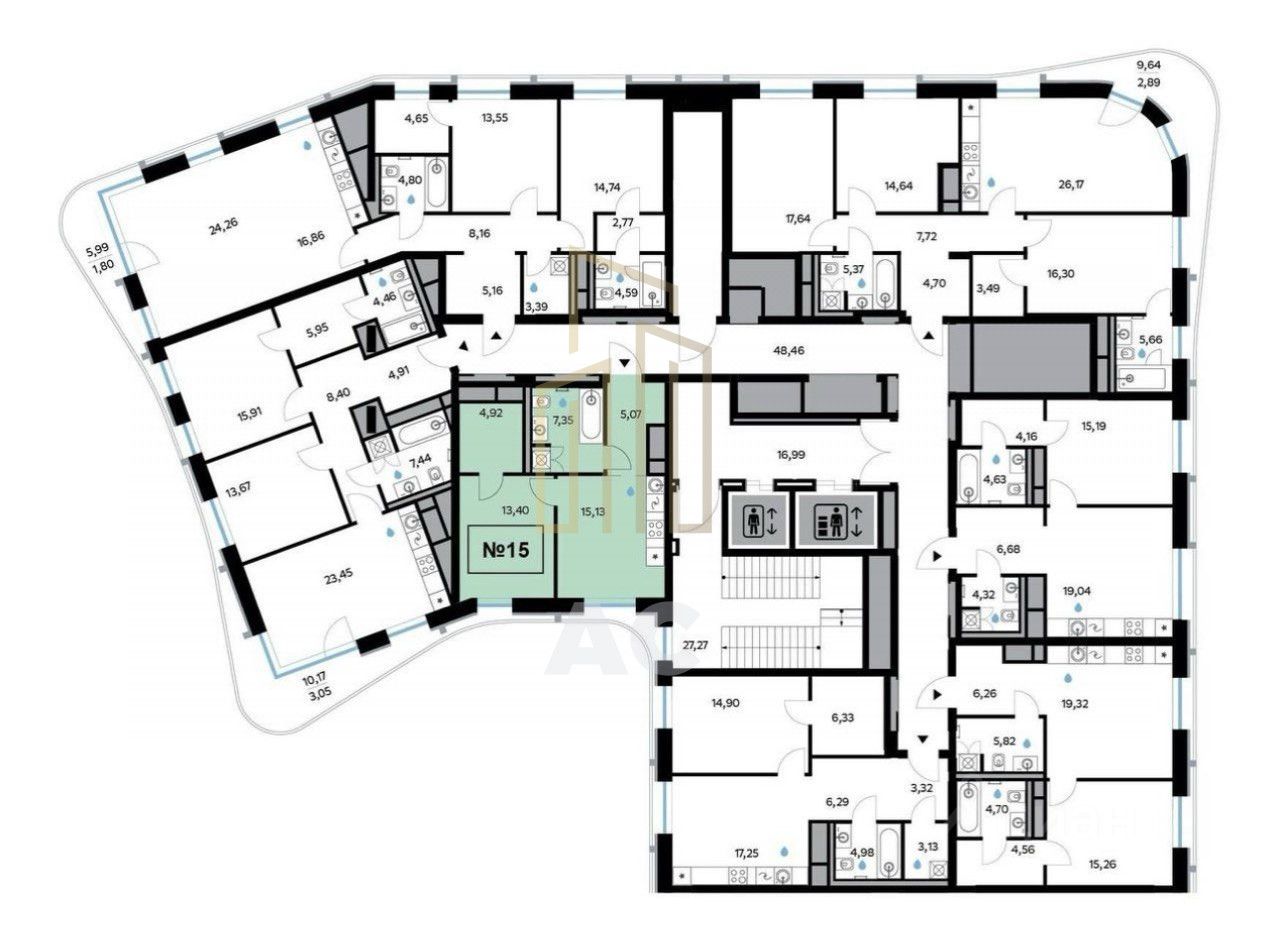 Площади помещений: жилая комната 13,40 кв.м., кухня-столовая 15,13 кв.м., прихожая 5,07 кв.м., санузел 7,35 кв.м., гардеробная 4,92 кв.м.