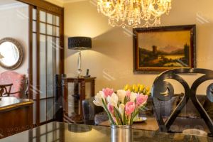 Вся мебель изготовлена из массива высококачественных пород дерева, с антикварным зеркалом 19 века, добавляющим нотку истории в современный интерьер.