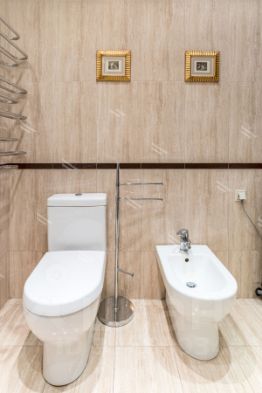 Душевой кабиной итальянской фирмы GLASS с джакузи и паровой баней, а также унитазом и биде от Villeroy & Boch.