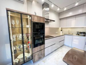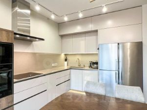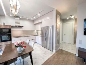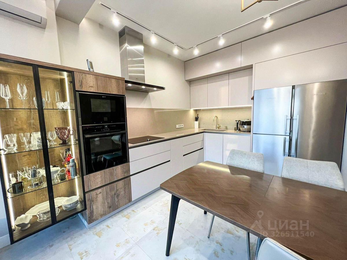 3. Кухня: мебель на заказ, шкафы в потолок, встраиваемая посудомоечная машина Miele, духовой шкаф с пиролизом и микроволновая печь Neff, варочная поверхность Goggenau 75 см, вытяжка Neff 90 см с WiFi, столешница и фартук из натурального камня Technistone, холодильник side-by-side Liebherr, смеситель Villeroy, мойка Blanco, измельчитель пищевых отходов InSinkErator Evolution 200.
