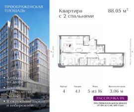 Квартира на 5 этаже в жилом комплексе премиум-класса "Преображенская площадь". Общая площадь: 88.05 кв.м.