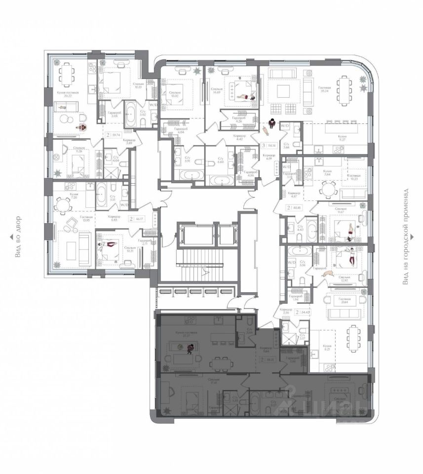 Внутренний двор 1,5 га функциональное и безопасное пространство для игр, работы и занятий спортом. Пешеходный променад для прогулок. Дома переменной этажности. Есть подземный паркинг.