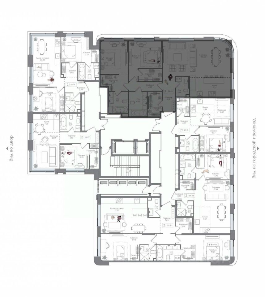 Внутренний двор 1,5 га функциональное и безопасное пространство для игр, работы и занятий спортом. Пешеходный променад для прогулок. Дома переменной этажности. Есть подземный паркинг.
