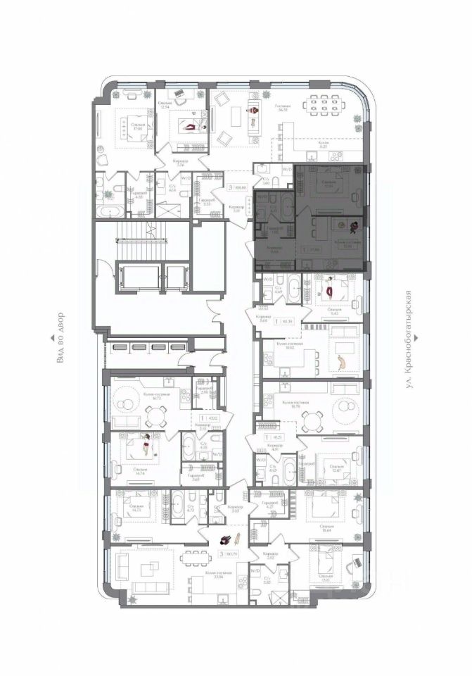 Внутренний двор 1,5 га функциональное и безопасное пространство для игр, работы и занятий спортом. Пешеходный променад для прогулок. Дома переменной этажности. Есть подземный паркинг.