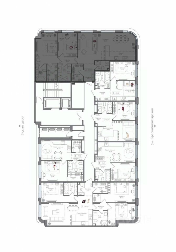 Внутренний двор 1,5 га функциональное и безопасное пространство для игр, работы и занятий спортом. Пешеходный променад для прогулок. Дома переменной этажности. Есть подземный паркинг.