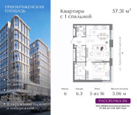Квартира на 5 этаже в жилом комплексе премиум-класса "Преображенская площадь". Общая площадь: 57.31 кв.м.
