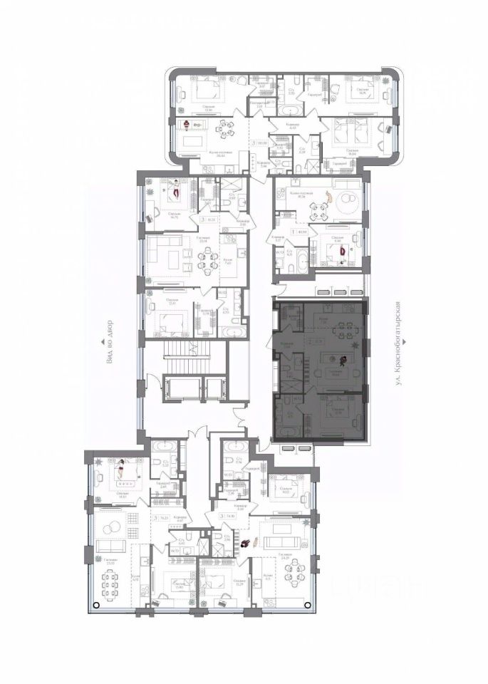 Внутренний двор 1,5 га функциональное и безопасное пространство для игр, работы и занятий спортом. Пешеходный променад для прогулок. Дома переменной этажности. Есть подземный паркинг.
