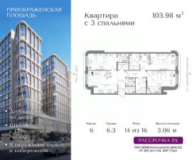 Квартира на 14 этаже в жилом комплексе премиум-класса "Преображенская площадь". Общая площадь: 103.98 кв.м.