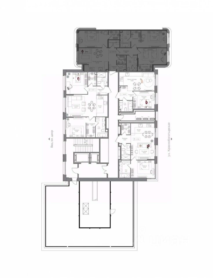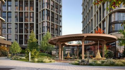 Внутренний двор 1,5 га функциональное и безопасное пространство для игр, работы и занятий спортом. Пешеходный променад для прогулок. Дома переменной этажности. Есть подземный паркинг.