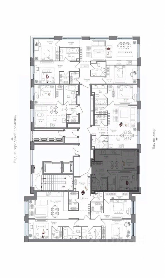 Внутренний двор 1,5 га функциональное и безопасное пространство для игр, работы и занятий спортом. Пешеходный променад для прогулок. Дома переменной этажности. Есть подземный паркинг.