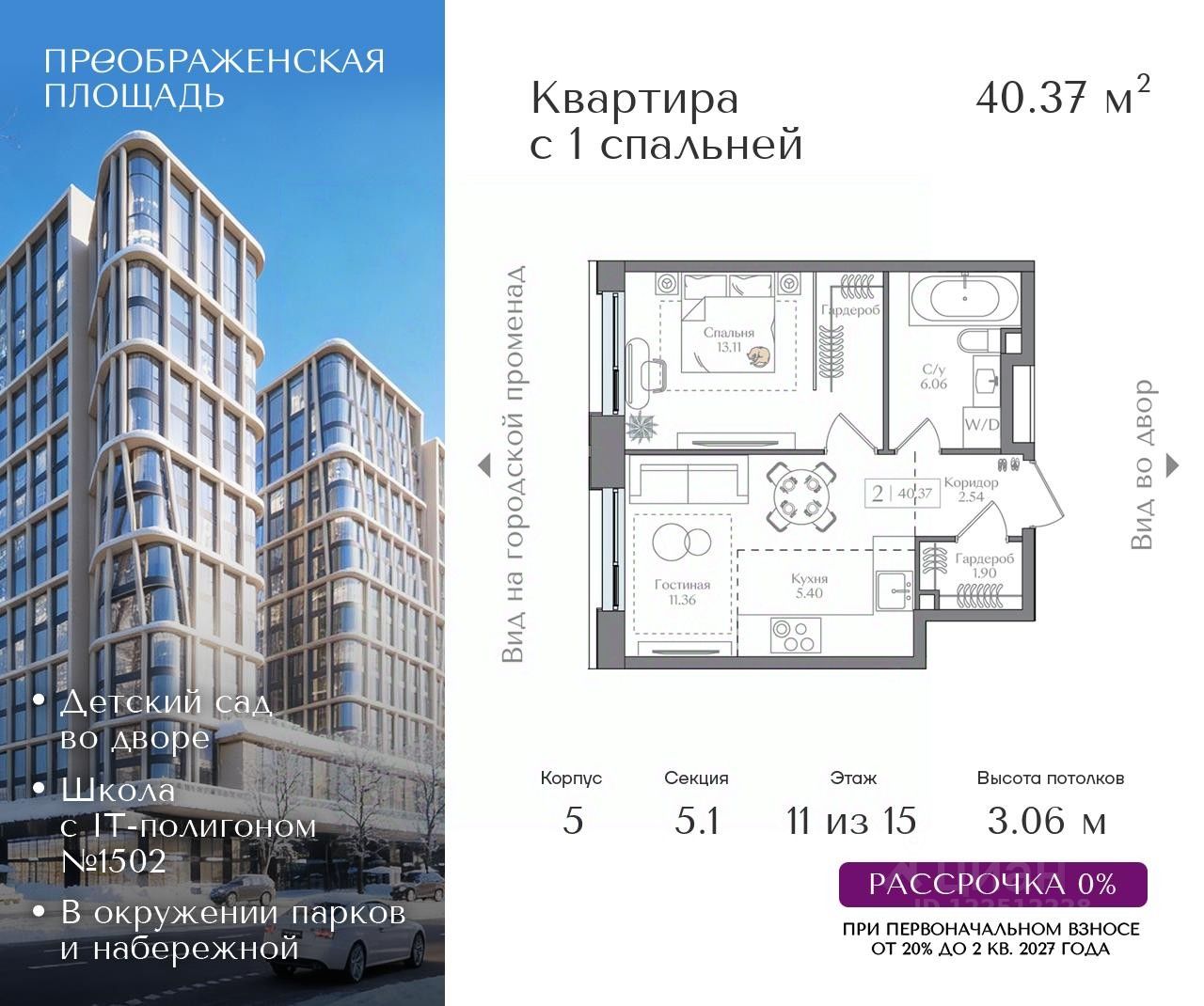 Квартира на 11 этаже в жилом комплексе премиум-класса "Преображенская площадь". Общая площадь: 40.37 кв.м.