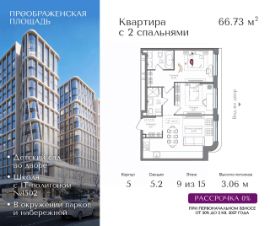 Квартира на 9 этаже в жилом комплексе премиум-класса "Преображенская площадь". Общая площадь: 66.73 кв.м.