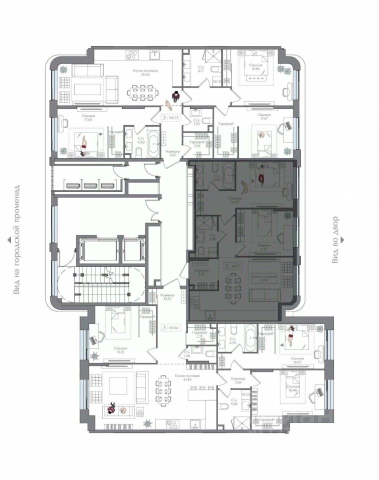Внутренний двор 1,5 га функциональное и безопасное пространство для игр, работы и занятий спортом. Пешеходный променад для прогулок. Дома переменной этажности. Есть подземный паркинг.