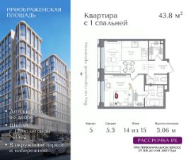 Квартира на 14 этаже в жилом комплексе премиум-класса "Преображенская площадь". Общая площадь: 43.8 кв.м.