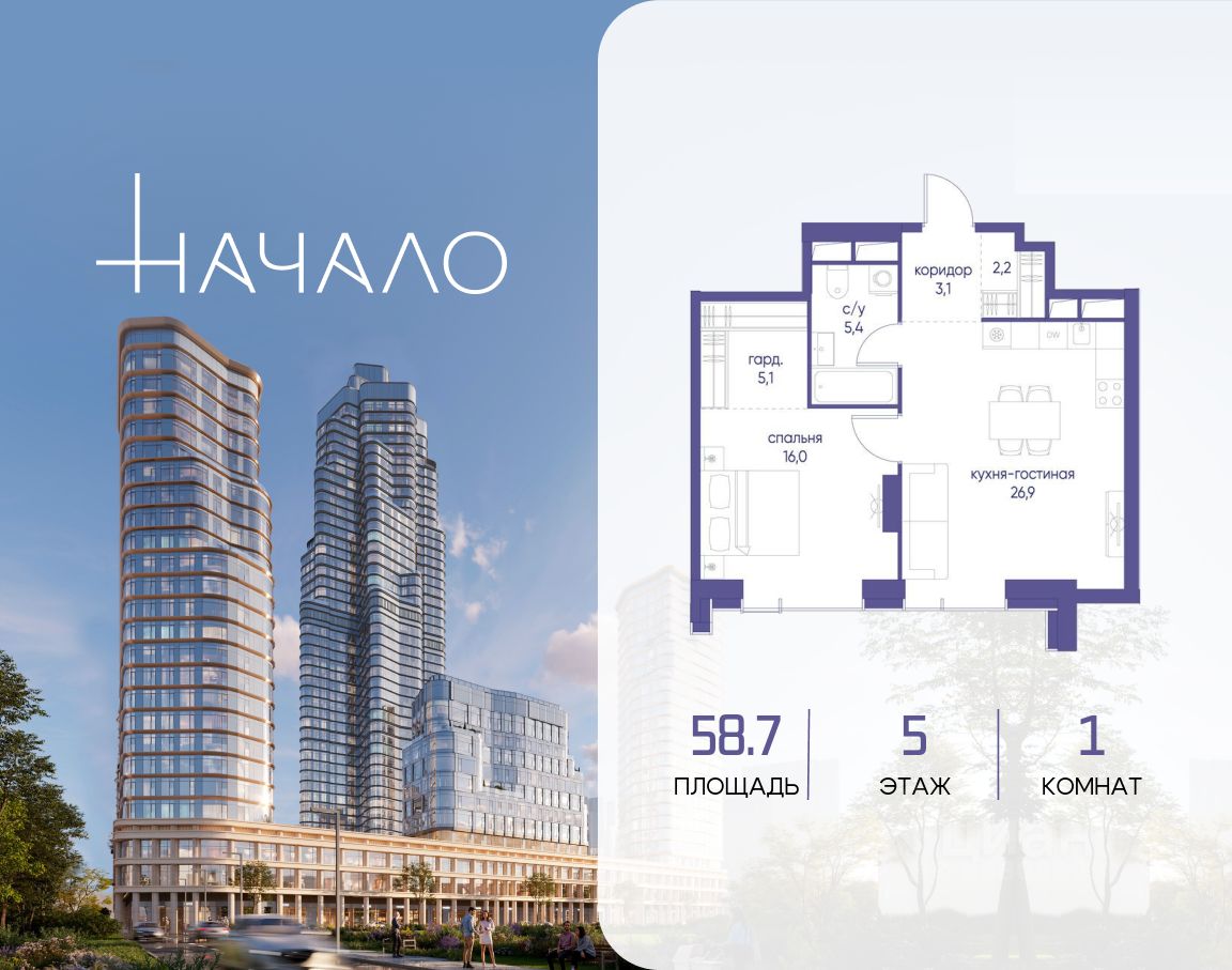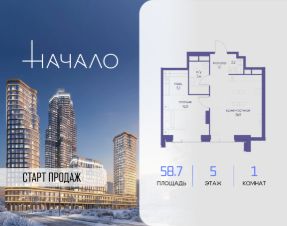 В престижном районе Пресня, на перекрестке делового и исторического центров Москвы, продается однокомнатная квартира площадью 58.70 кв. м без отделки. Квартира находится на 5 этаже 48-этажного дома, в новом элитном жилом комплексе "Начало" от девелопера "Донстрой". Реализация проекта запланирована на 1 квартал 2030 года.