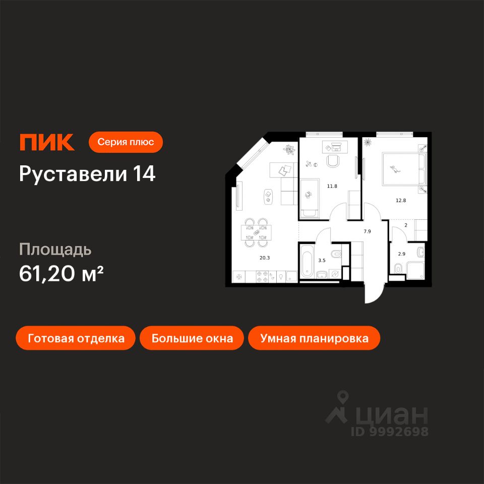 Продаётся 2-комн. квартира площадью 61,2 кв.м на 17 этаже 21 этажного дома (Корпус 3.5, Секция 1) проекта ПИК Руставели 14. Светлый просторный подъезд на уровне земли, функциональная планировка, большие окна, c отделкой.