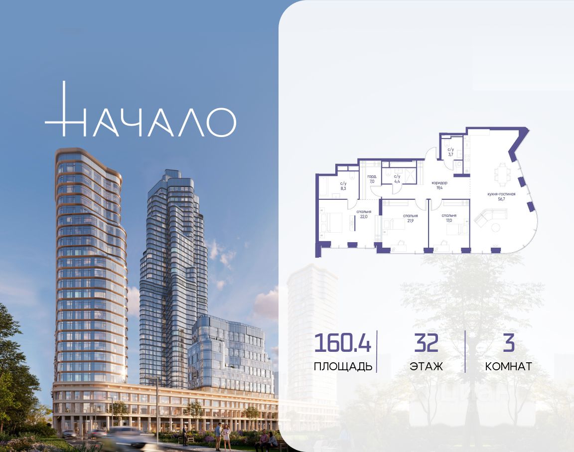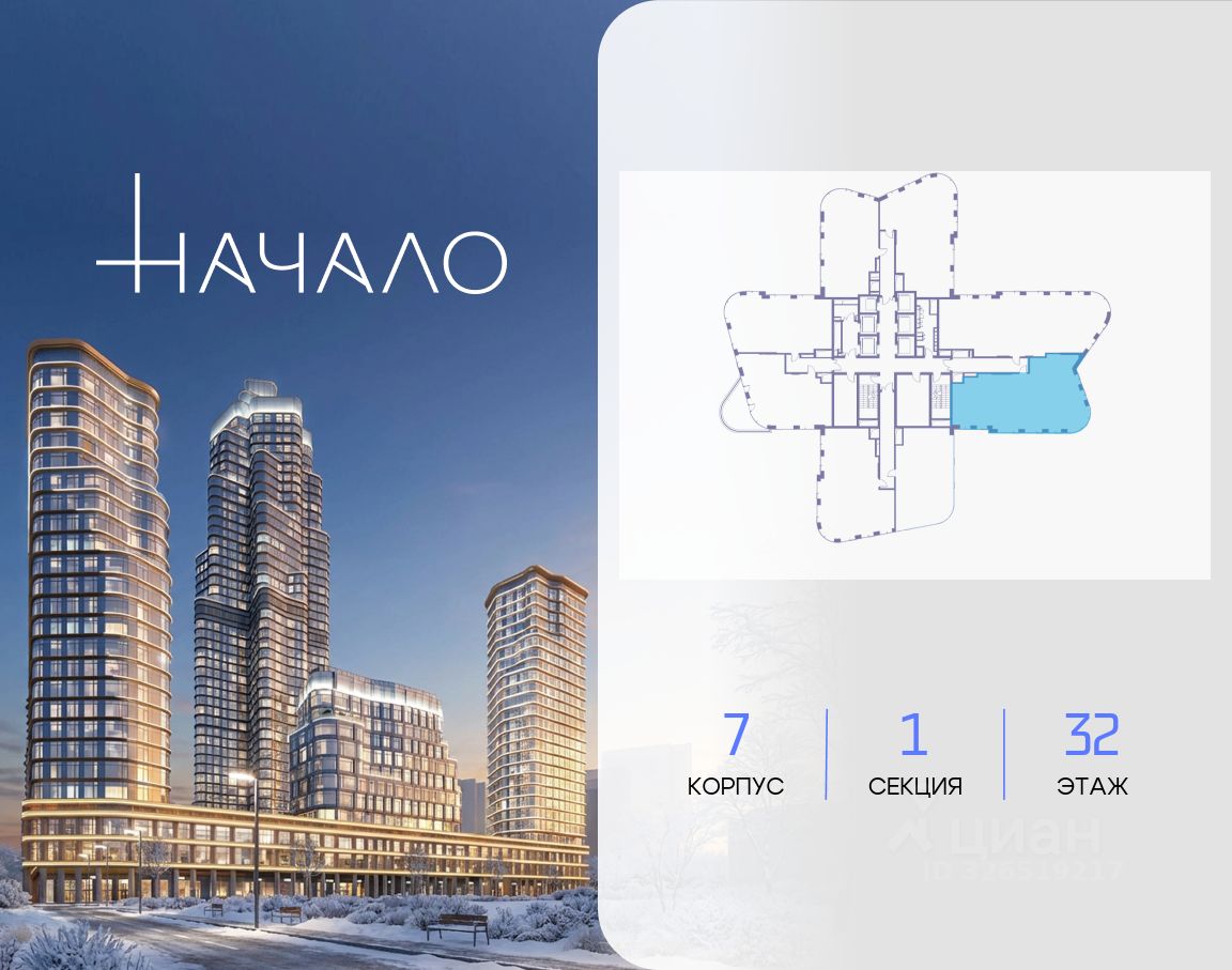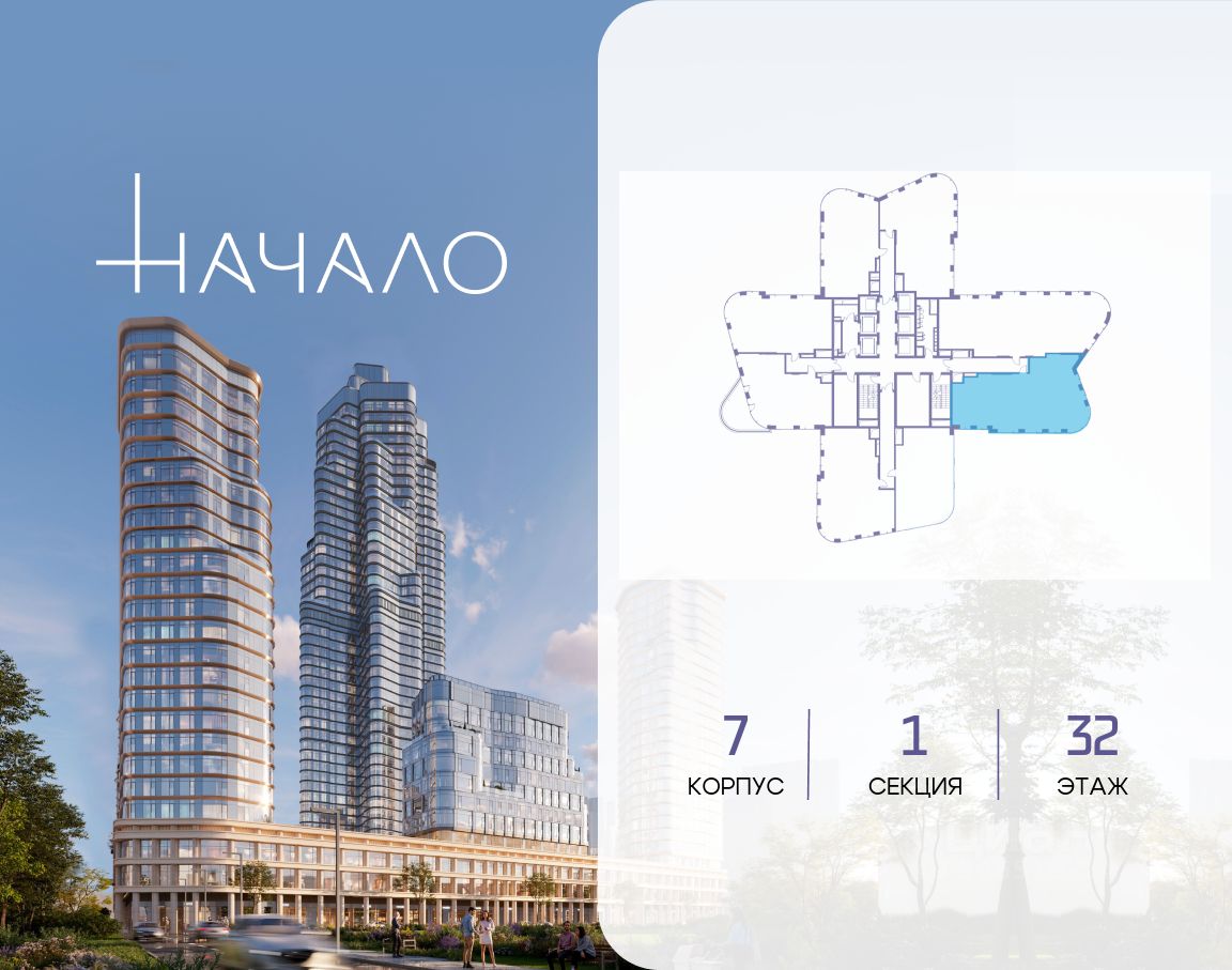 В престижном районе Пресня, на перекрестке делового и исторического центров Москвы, продается трехкомнатная квартира площадью 160.40 кв. м без отделки. Квартира находится на 32 этаже 48-этажного дома, в новом элитном жилом комплексе "Начало" от девелопера "Донстрой". Реализация проекта запланирована на 1 квартал 2030 года.