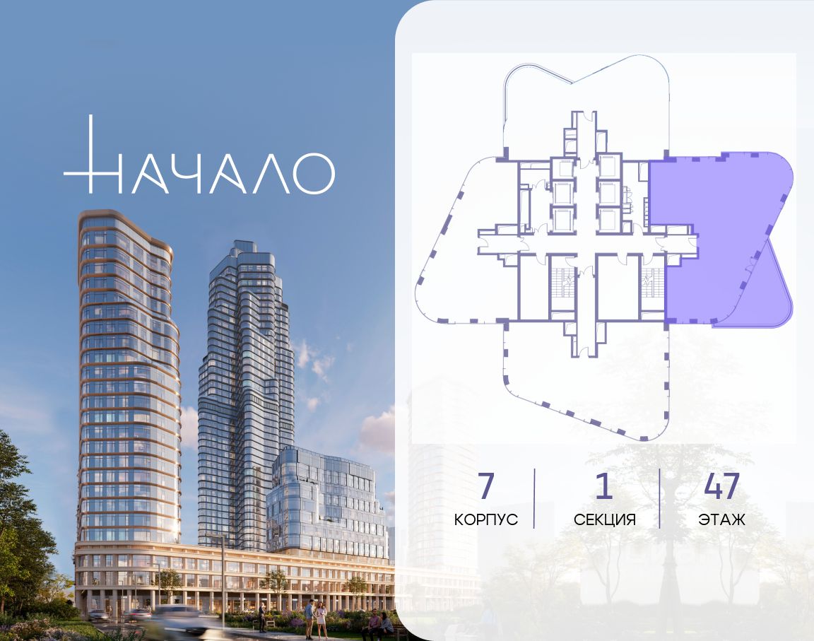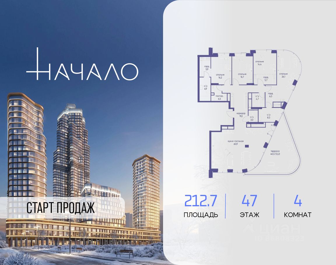 В престижном районе Пресня, на перекрестке делового и исторического центров Москвы, продается четырехкомнатная квартира площадью 212.70 кв. м без отделки. Квартира находится на 47 этаже 48-этажного дома, в новом элитном жилом комплексе "Начало" от девелопера "Донстрой". Реализация проекта запланирована на 1 квартал 2030 года.