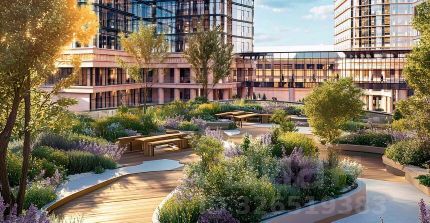 Открытый променад - сквозной маршрут на крыше стилобата с зонами отдыха, занятий спортом, детских игр и совместной работы. Все площадки плавно связаны между собой прогулочной дорожкой.