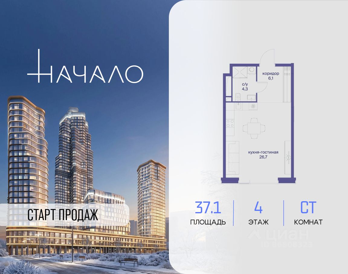 В престижном районе Пресня, на перекрестке делового и исторического центров Москвы, продается студия площадью 37.10 кв. м без отделки. Квартира находится на 4 этаже 11-этажного дома, в новом элитном жилом комплексе "Начало" от девелопера "Донстрой". Реализация проекта запланирована на 1 квартал 2030 года.