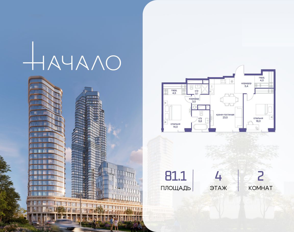 В престижном районе Пресня, на перекрестке делового и исторического центров Москвы, продается двухкомнатная квартира площадью 81.10 кв. м без отделки. Квартира находится на 4 этаже 24-этажного дома, в новом элитном жилом комплексе "Начало" от девелопера "Донстрой". Реализация проекта запланирована на 1 квартал 2030 года.