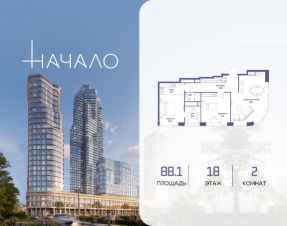 В престижном районе Пресня, на перекрестке делового и исторического центров Москвы, продается двухкомнатная квартира площадью 88.10 кв. м без отделки. Квартира находится на 18 этаже 24-этажного дома, в новом элитном жилом комплексе "Начало" от девелопера "Донстрой". Реализация проекта запланирована на 1 квартал 2030 года.