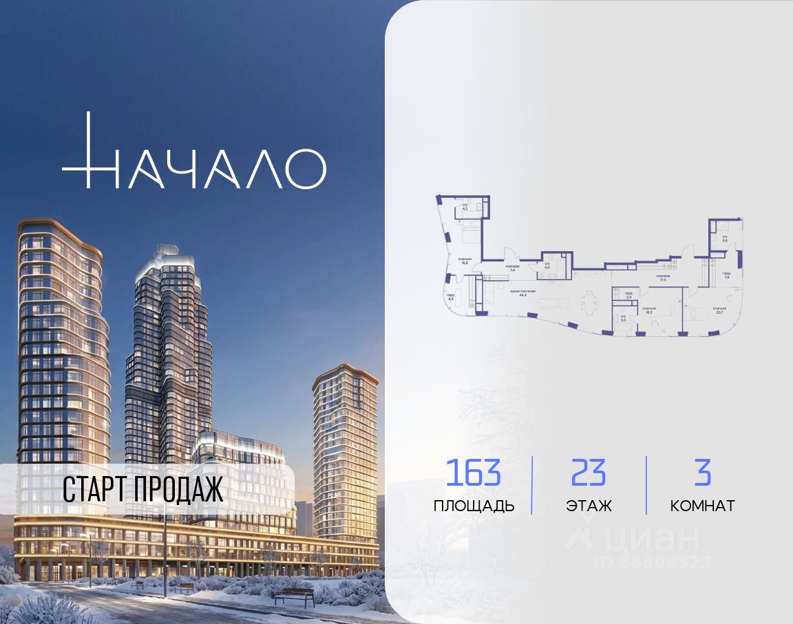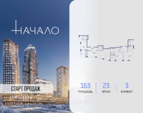 В престижном районе Пресня, на перекрестке делового и исторического центров Москвы, продается трехкомнатная квартира площадью 163.00 кв. м без отделки. Квартира находится на 23 этаже 24-этажного дома, в новом элитном жилом комплексе "Начало" от девелопера "Донстрой". Реализация проекта запланирована на 1 квартал 2030 года.