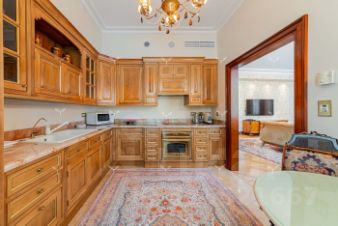 В квартире выполнена дорогая отделка в классическом стиле с использованием натуральных материалов премиум-класса: дерево, мрамор.