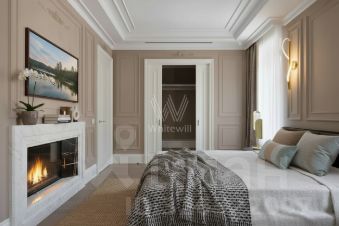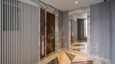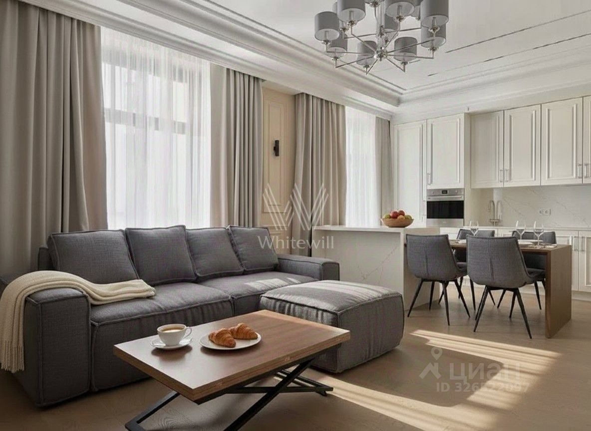 Квартира с премиальной дизайнерской отделкой и мебелью расположена на втором этаже. Светлый интерьер оформлен в стиле современной классики. Высокие потолки, большие окна со стороны кухни-гостиной.