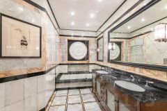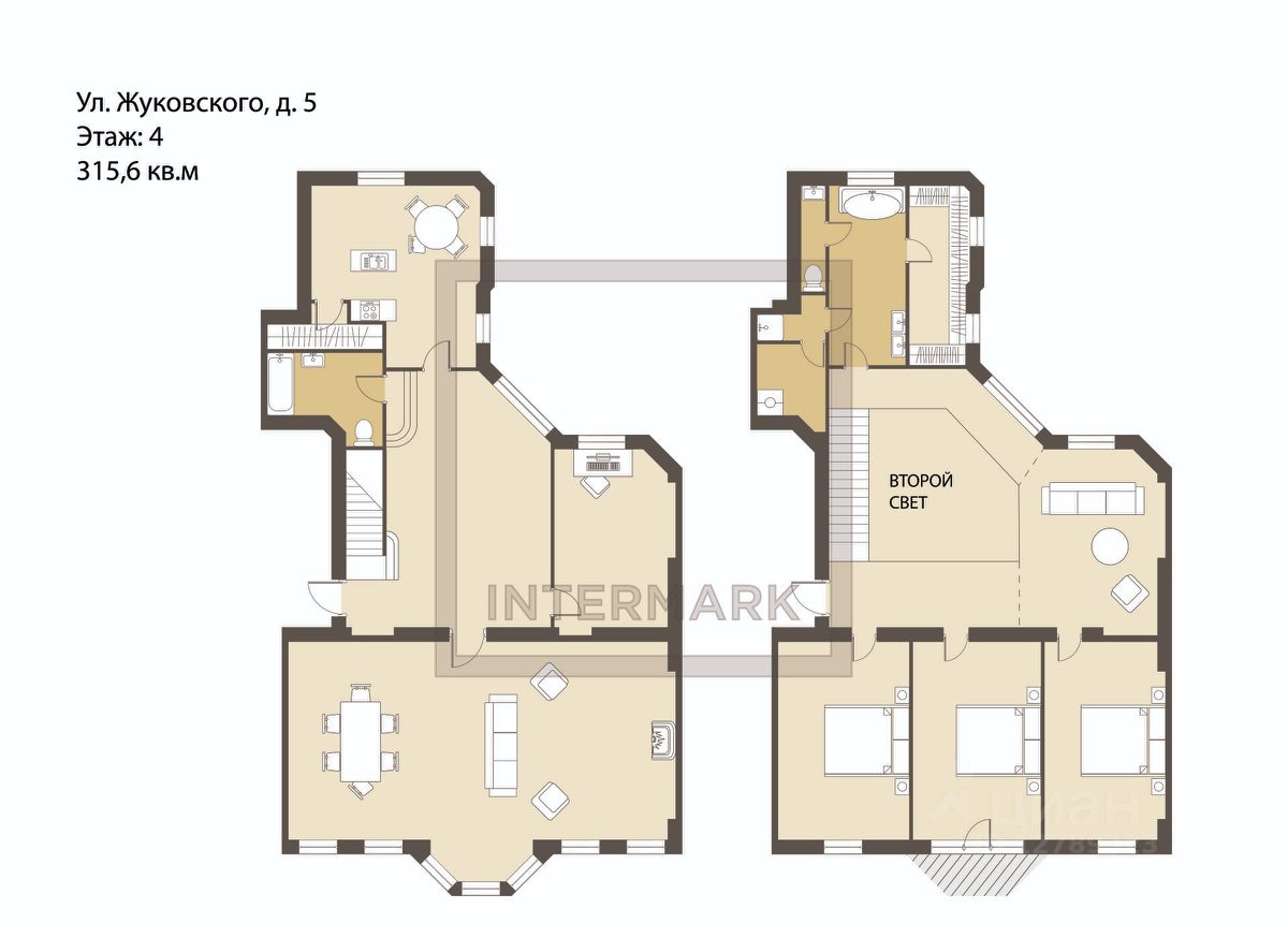 Квартира разделена на два уровня на первом расположены просторная светлая гостиная, уютная кухня, ванная комната и рабочий кабинет. На втором уровне три спальни, ванная и гардеробная. Уровни соединены между собой роскошной парадной лестницей со вторым светом.