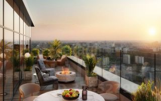 Внутри есть приватный двор с оригинальным ландшафтным дизайном, а также просторное лобби с потолками высотой до 10 метров, лаунж-зоной, мягкими диванами и огромным камином.