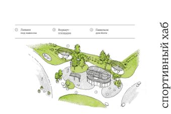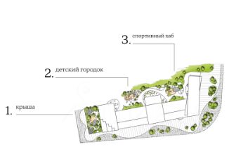 • Многоуровневый игровой комплекс вдохновлен образом домика на дереве. В его центре — башня с горкой. Около детской площадки располагается стеклянный павильон для родителей.