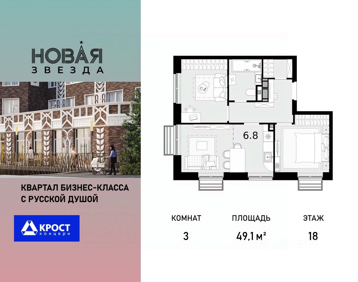 Продаётся 3-к квартира 49.1 кв.м. на 18-м этаже 21 этажного дома, корпус 1 - Резиденция "Вологда". Без отделки.