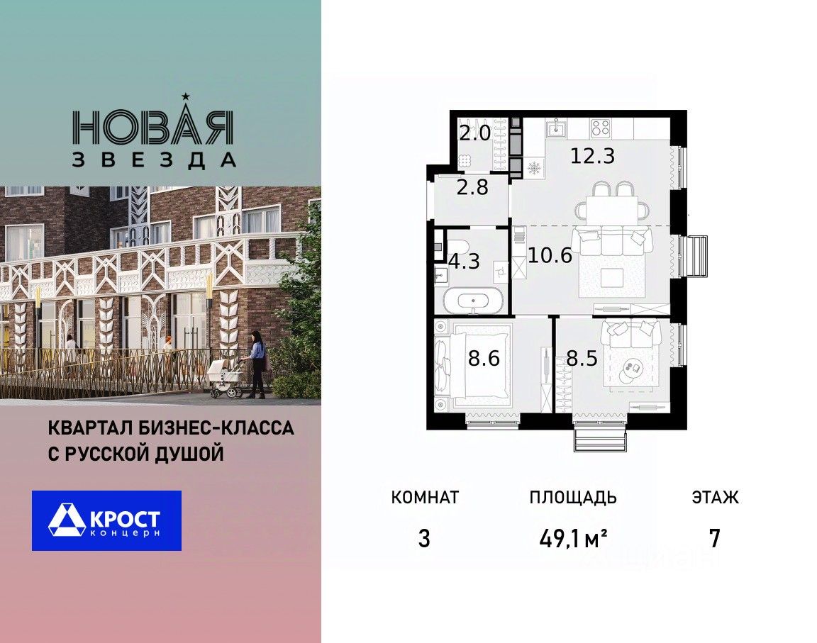 Продаётся 3-к квартира 49.1 кв.м. на 7-м этаже 21 этажного дома, корпус 1 - Резиденция "Вологда". Без отделки.