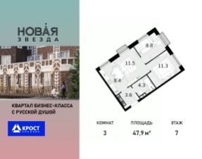 Продаётся 3-к квартира 47.9 кв.м. на 7-м этаже 21 этажного дома, корпус 1 - Резиденция "Вологда". Без отделки.